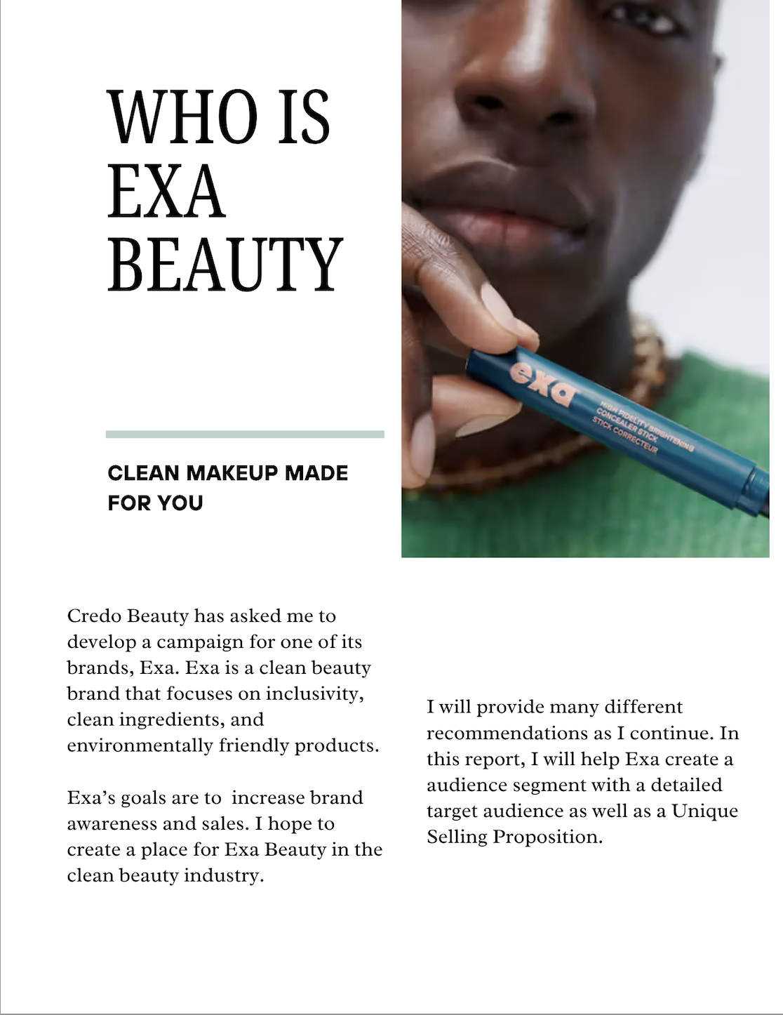 Our task was to research and define Exa Beauty’s target audience, identity key values, and recommend brand strategy. We were to present it in a visually pleasing way while staying on brand.